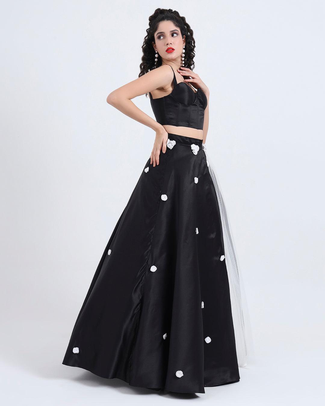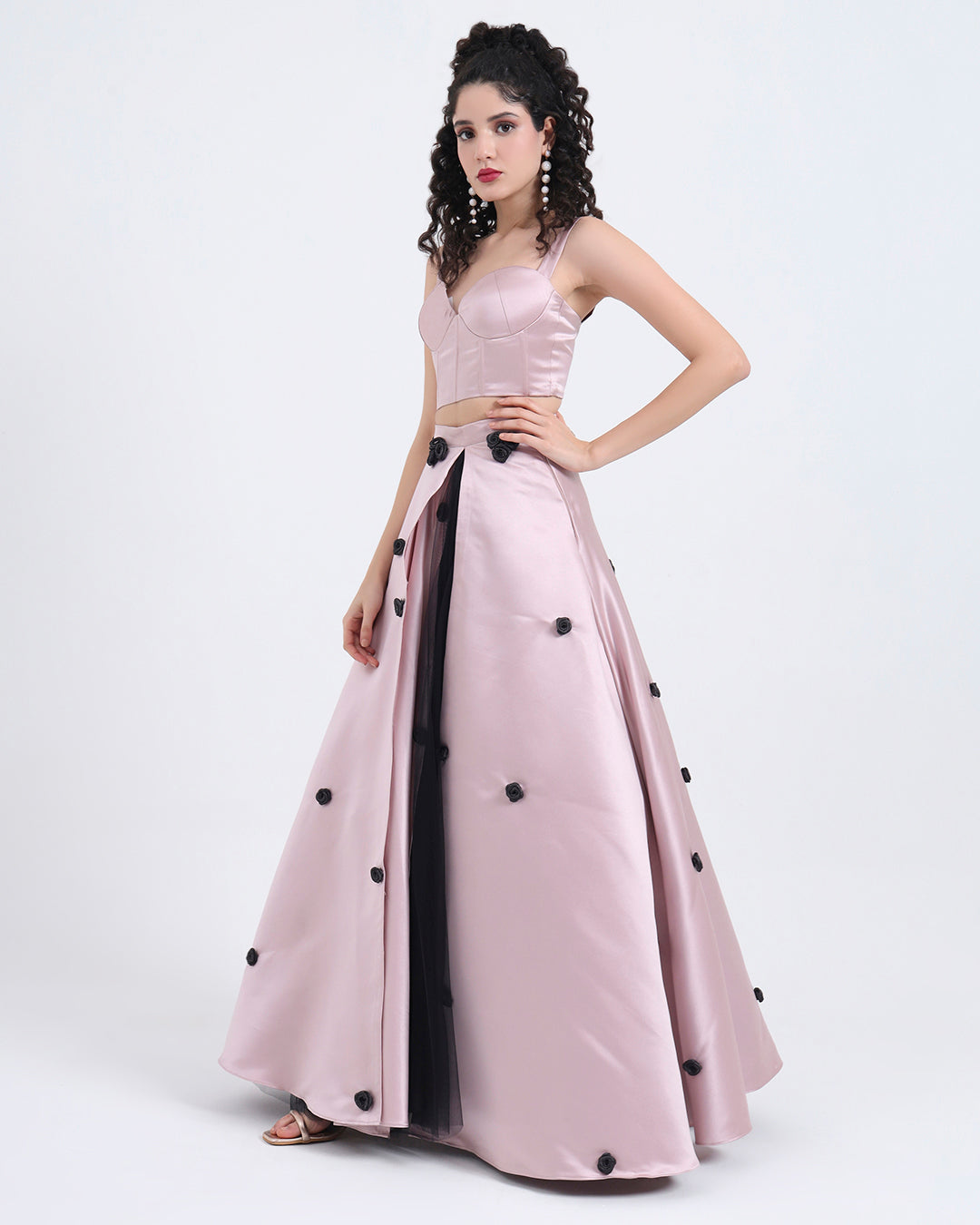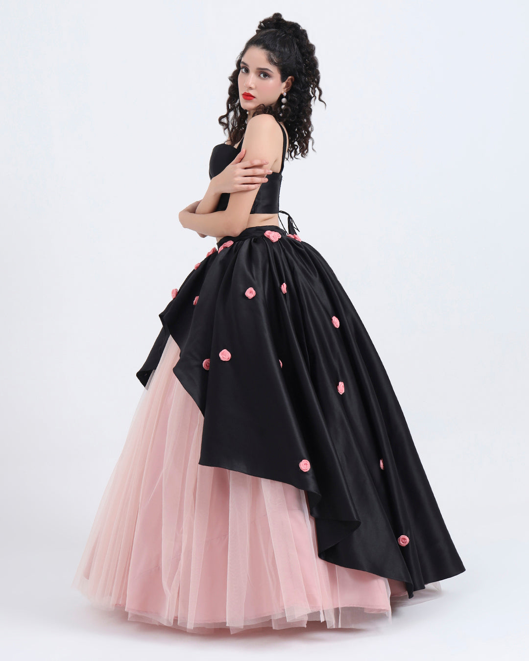 Step into soft romance with an edge. This black satin and blush tulle gown combines bold structure with dreamy femininity, making it a standout piece for women who love couture-inspired fashion.
