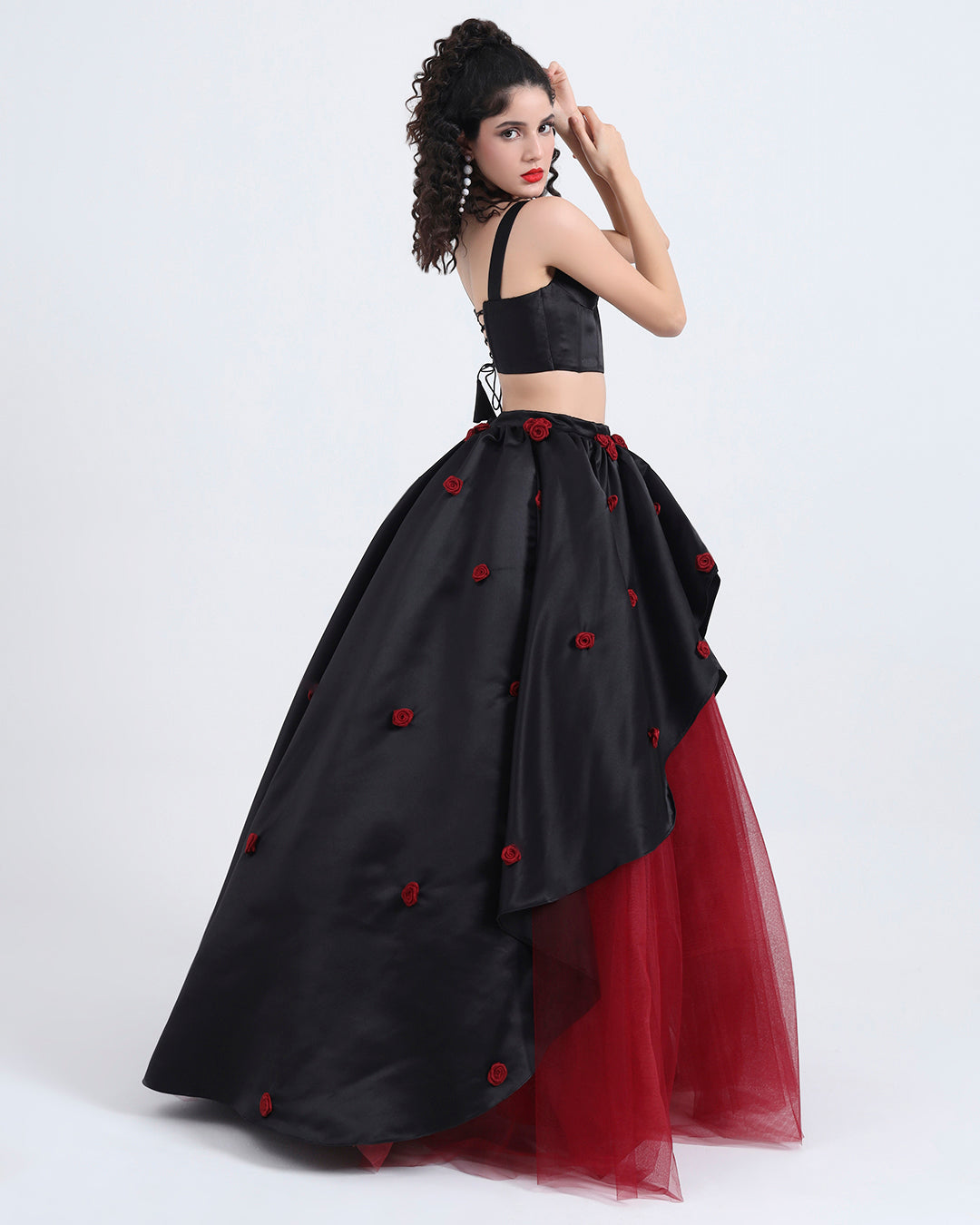 Turn every entrance into a cinematic moment with this stunning black satin and wine tulle gown, crafted for women who love bold fashion with a touch of romance.